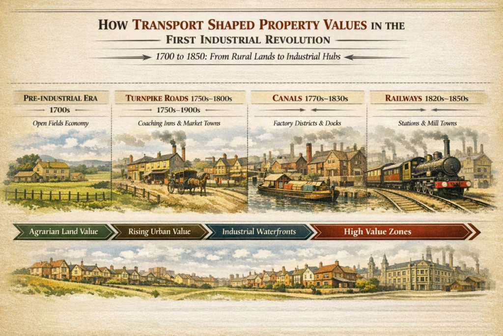 This diagram illustrates how successive waves of transport innovation reshaped land use and property values during the First Industrial Revolution.In the early 1700s, Britain’s economy was still rooted in an agrarian landscape where land value depended on farming productivity and proximity to local markets.The introduction of turnpike roads in the mid‑18th century began to shift this pattern, creating new commercial corridors around coaching inns and market towns.As canals arrived from the 1770s, industrial districts clustered along these efficient freight routes, pushing up the value of waterfront land and attracting factories, warehouses, and workers.The arrival of railways in the 1820s accelerated this transformation dramatically: stations became new urban anchors, mill towns expanded at unprecedented speed, and previously remote areas surged in value.Together, these transport revolutions redefined the geography of economic opportunity, proving that in the industrial age, infrastructure was the most powerful driver of property value.