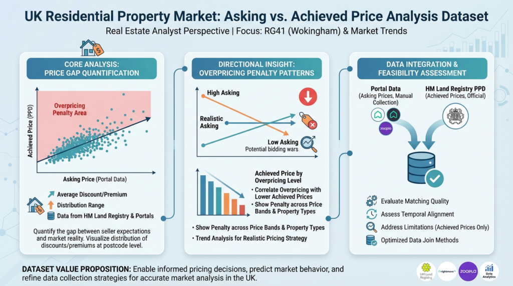 This diagram compares asking prices from property portals with achieved sale prices from HM Land Registry to show how accurately homes are priced in RG41. The scatter plot highlights the ‘overpricing penalty’ — where ambitious asking prices ultimately lead to lower achieved values — while realistic pricing tends to deliver stronger outcomes. By combining portal data with official sold‑price records, the chart reveals how seller expectations align with market reality and why pricing strategy is one of the strongest drivers of final sale performance.