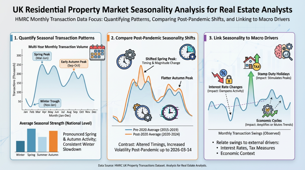 This diagram illustrates how UK property transactions follow a clear seasonal rhythm, with activity typically peaking in spring and again in early autumn before dropping sharply over winter. By comparing pre‑ and post‑pandemic averages, the chart also shows how these patterns have shifted in recent years, with more volatility and altered peak timings. The infographic links these swings to wider economic forces — from stamp duty holidays to interest rate changes — helping readers understand how both seasonal behaviour and macro conditions shape the flow of housing market activity