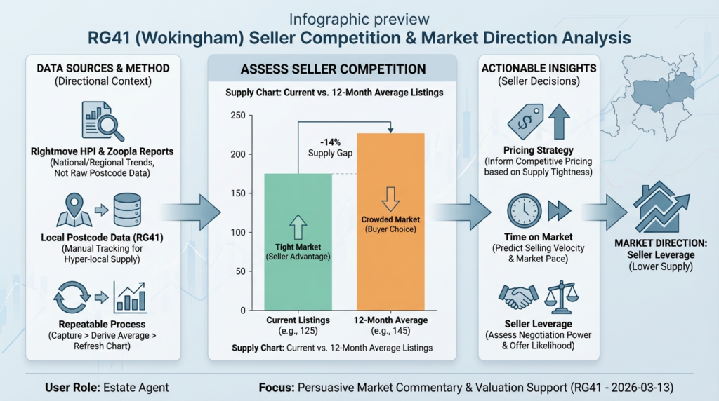 This diagram shows how the current number of homes for sale in RG41 compares with the 12‑month average, giving a quick read on how much competition sellers face. The chart highlights that current listings sit well below the typical annual level, indicating a tight market where sellers have more leverage, stronger pricing power and a higher likelihood of attracting motivated buyers. By contrasting today’s supply with longer‑term norms, the diagram helps homeowners understand whether they’re entering a crowded market or one where limited choice works in their favour.