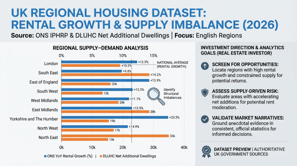 This diagram compares regional rental growth with the number of new homes delivered each year, highlighting where demand is rising faster than supply. By placing ONS rental inflation alongside DLUHC net additional dwellings, the chart reveals which regions face the greatest supply–demand pressure and where rental markets are tightening most sharply. The visual helps readers understand why some areas experience rapid rent increases while others remain more balanced, offering a clear, data‑driven view of regional housing dynamics.
