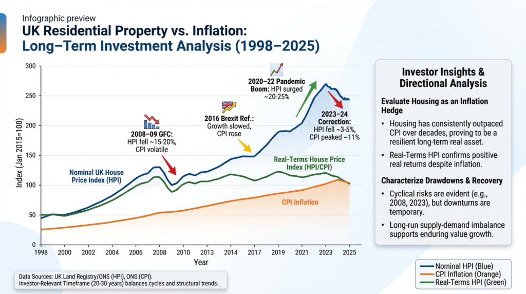 This diagram compares UK house prices with inflation over the past two decades, showing how property has performed both in cash terms and after adjusting for rising prices. By plotting nominal HPI, CPI inflation, and a real‑terms house‑price index, the chart highlights how major events such as the financial crisis, Brexit and the pandemic shaped the market. The visual makes clear that, despite cyclical downturns, UK housing has consistently outpaced inflation over the long run, reinforcing its role as a resilient real asset.