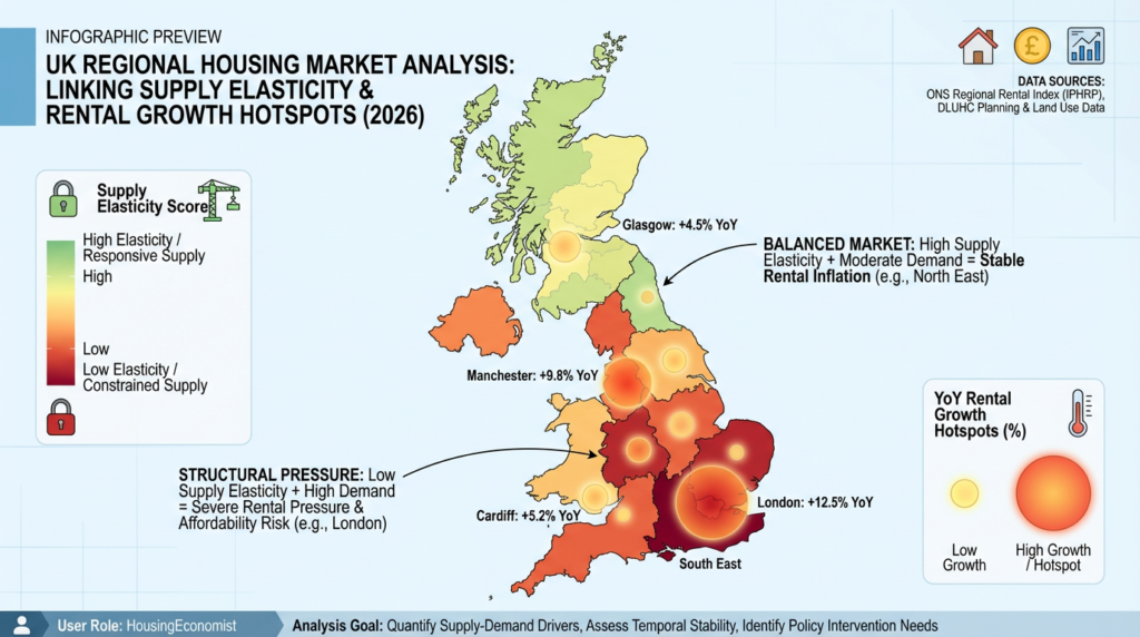 The diagram maps rental‑growth hotspots onto regional supply‑elasticity scores to show where demand pressure is colliding with constrained housing supply. Regions shaded red have low supply elasticity, meaning they struggle to build enough homes, while the overlaid circles highlight where rents are rising fastest. Together, the visual reveals the areas facing the greatest structural pressure — such as London and parts of the North West — and contrasts them with more balanced markets where supply can respond more easily to demand.